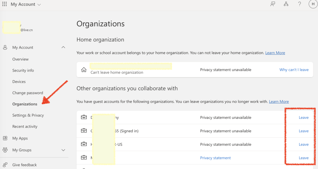 As shown in the figure, when I try to click the “Leave” button in the Entra ID portal, I am redirected to the “My Account” page in Microsoft 365 and prompted to sign in.