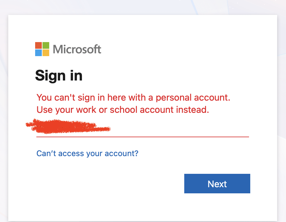 If you see an error while signing in with a personal Microsoft account, you can still sign in by using the domain name for your organization (such as contoso.com) or the Tenant ID of your organization from your administrator in one of the following URLs: